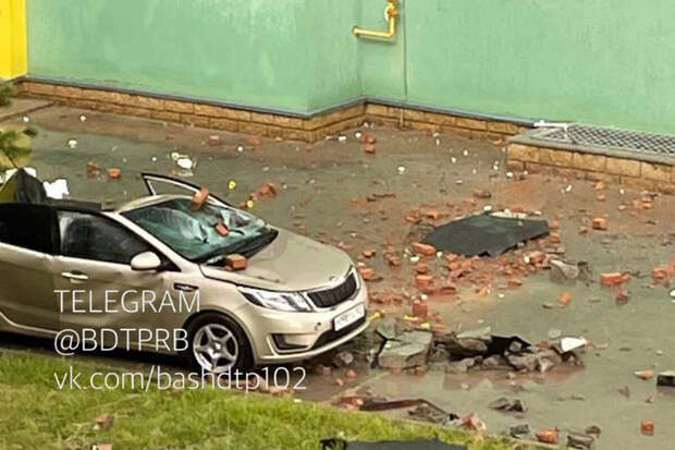 В Башкирии во время сильного дождя и ветра на автомобиль, припаркованный около многоэтажного дома, упал кусок бетона и кирпичной кладки. В результате автомобиль оказался уничтожен, сообщает Telegram-канал "БашДТП" и публикует видеозапись инцидента.