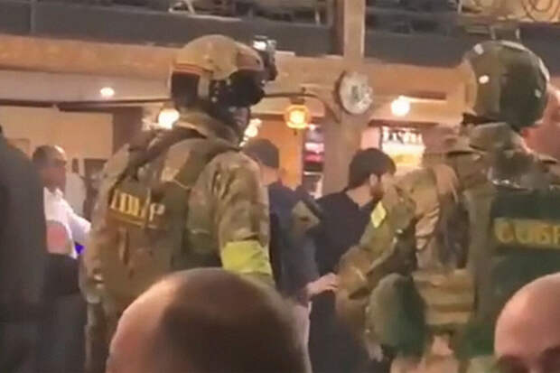 На записи видно заставленный длинными столами зал. У выхода из ресторана собрались десятки возмущенных мужчин, рядом с которыми стоят вооруженные силовики в форме с нашивками СОБР. При этом гости старшего возраста не покинули своего места.