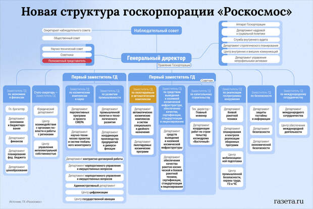 С первого августа 2024 года вступил в силу приказ об учреждении новой организационной структуры госкорпорации "Роскосмос", схема которой попала в распоряжение "Газеты.Ru".