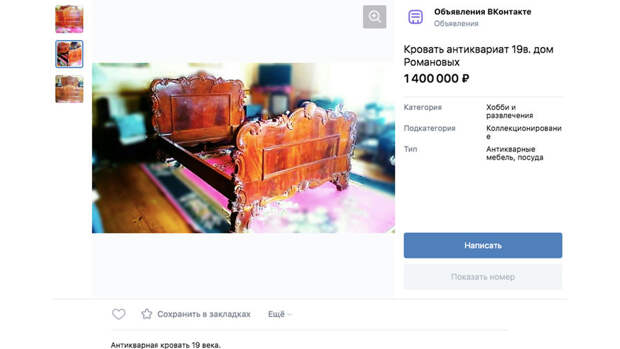 Доказательств того, что кровать принадлежала именно неназванной фаворитке императора Николая II, автор объявления не приводит. Однако приветствует "любые проверки с вашей стороны за ваш счет".