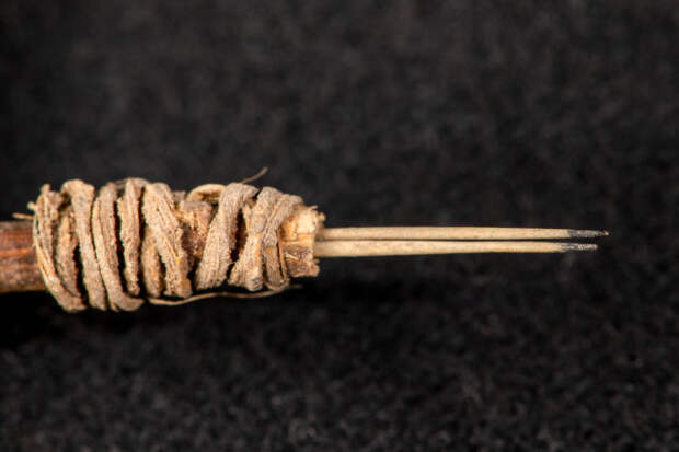 Оно состоит из двух игл кактуса, прикрепленных жгутом из листьев юкки к деревянной ручке. Возраст находки составляет около 2000 лет, до этого самым старым находкам было около 700-900 лет. На концах игл еще сохранилась краска. Анализ показал, что она состояла преимущественно из угля.Хотя татуировки играли важную роль во множестве культур по всему миру, антропологам мало известно об истоках этого вида искусства. Одна из причин - крайне малое количество сохранившихся инструментов для нанесения татуировок в древности.
