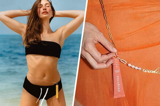 Хейли Бибер опубликовала кадры из новой рекламной кампании косметической марки Rhode. На снимках модель позировала в купальнике, который дополнила золотой цепочкой с блеском для губ.