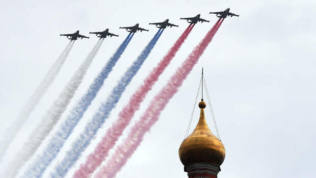 Сообщается, что над Красной площадью прошли минимум две группы самолетов с участием Су-27 и Су-25.