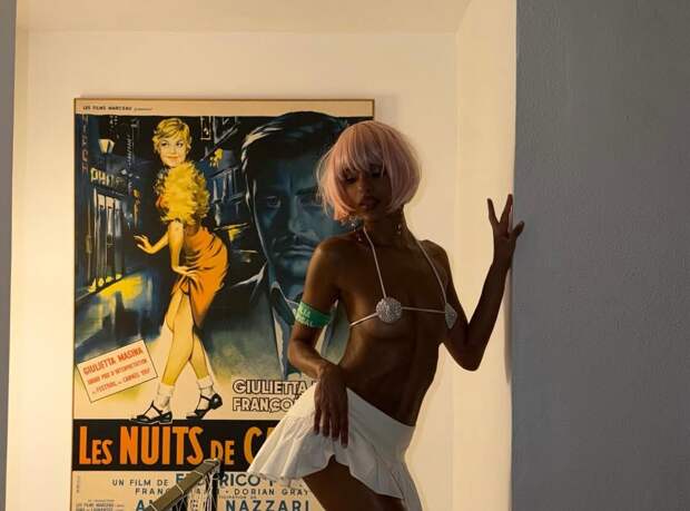 29-летняя Нара Баптиста показала фигуру в крошечном топе со стразами на груди, который сочетала с белой ультракороткой юбкой и неоновыми босоножками на каблуках. Модель примерила розовый парик со стрижкой.