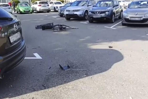 На видеозаписи, размещенной в Telegram-канале, продемонстрированы фрагменты дрона, лежащие на автомобильной парковке рядом с транспортными средствами.