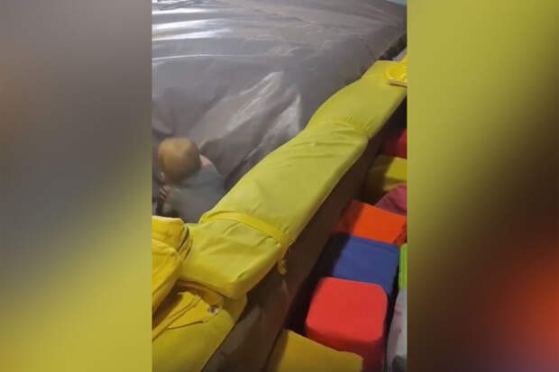 На кадрах ролика, который сняла женщина, видно, как маленький ребенок играет в сухом бассейне с мягкими кубиками, в какой-то момент мальчик решил перебраться на соседний батут и провалился в дыру между надувными конструкциями.