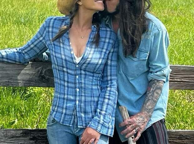Элизабет Херли и Билли Рэй Сайрус были запечатлены на ферме. Певец целовал возлюбленную в щеку. Актриса позировала в соломенной шляпе, голубой рубашке, джинсах и солнцезащитных очках.