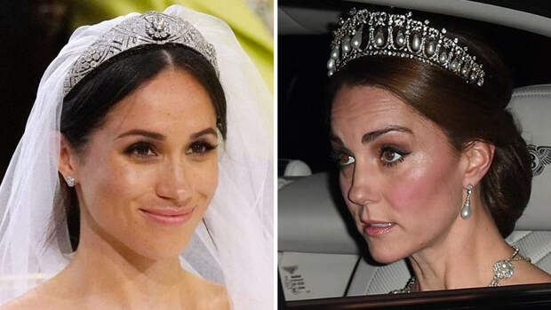 Эксперты сразу отметили, что в образе Меган чего-то недостает, что в тот вечер выглядело особенно комично — в тот же вечер Кейт появилась на торжественном ужине в Букингемском дворце в одной из самых популярных диадем принцессы Дианы. Шедевр ювелирного искусства под названием "Узел любовников" ("Lovers' Knot") состоит из бриллиантов и грушевидных жемчужин и появлялся на голове герцогини Кэтрин уже три раза — в 2013-м, 2015-м и 2018-м годах.