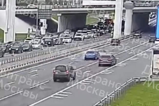 Инцидент произошел на 17-м километре шоссе. Как видно на записи, в средней полосе остановилась легковушка, у нее был поднят капот.