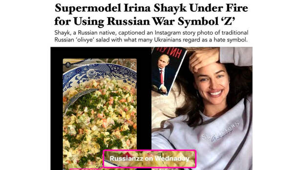 Негодование интернет-пользователей вызвала история, опубликованная Ириной Шейк в Instagram 13 июля. Модель показала подписчикам свой "ужин по-русски" с салатом "Оливье" и малосольными огурцами и подписала историю: "Russianzz on Wednasday".