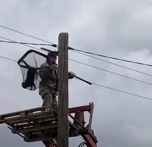 Один из мужчин забрался на подъемник и, добравшись до застрявшего на столбе кота, посадил его в сачок."Хвостик благополучно спущен на землю, жив, здоров", — отмечается в материале.