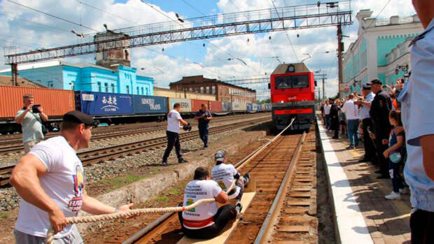 В Свердловской области установили новый рекорд России: двое атлетов за 52 секунды отбуксировали состав весом 300 тонн на 9 м 45 см на железнодорожном вокзале станции Камышлов, сообщает региональный информационный портал.