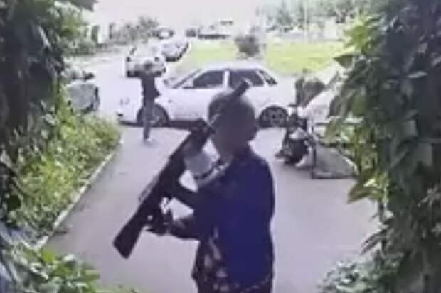 На кадрах ролика, ребенок которому на вид не более 12 лет, с трудом заряжает ружье о землю возле дома, вплотную подходит к камере домофона, стреляет по ней и спокойно удаляется.