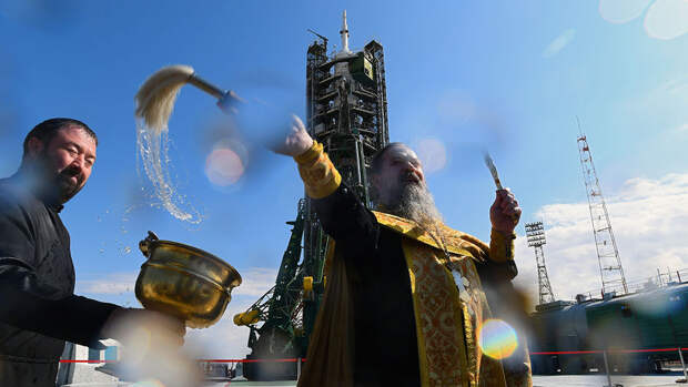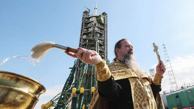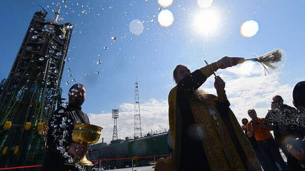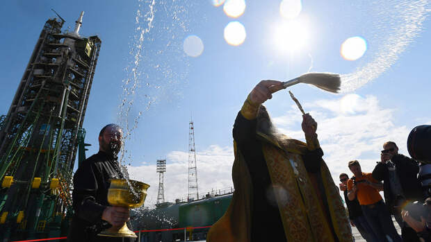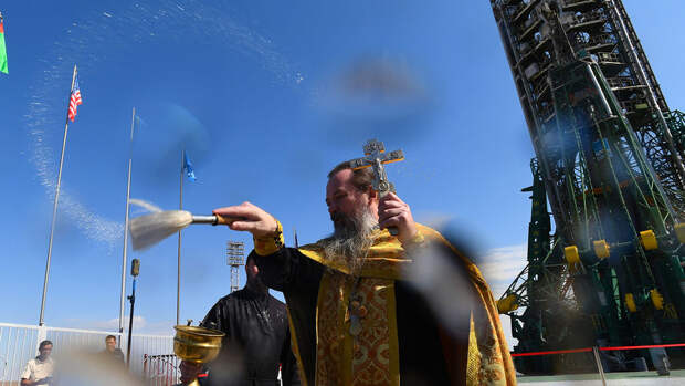 На Байконуре прошел традиционный обряд освящения космической ракеты "Союз-ФГ" с пилотируемым кораблем "Союз МС-15", которая вскоре стартует к МКС. Освящал ракету духовник "Роскосмоса" отец Сергий.