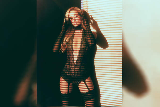 45-летняя Пэрис Хилтон предстала перед камерой в черном кружевном прозрачном боди с глубоким декольте, которое дополнила поясом, чулками, длинными перчатками, туфлями на каблуках и серьгами.