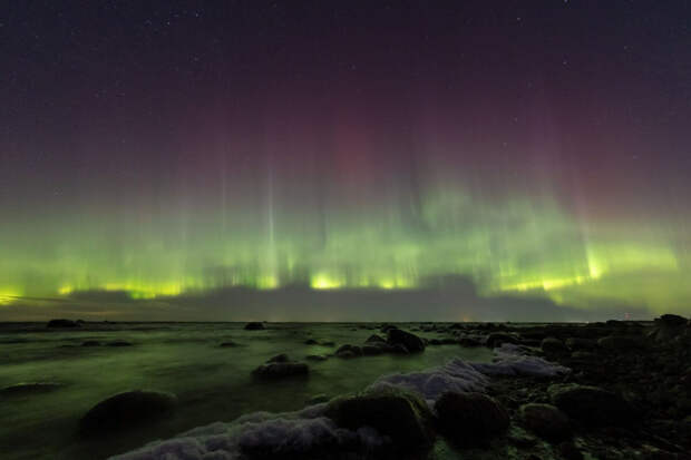 В Шепелево на берегу Финского залива можно было увидеть ажурное северное сияние, когда в небе сначала появились дюны, а затем "заполыхало ярко-ярко". Зафиксировали даже полеты метеоров, отмечают авторы поста.