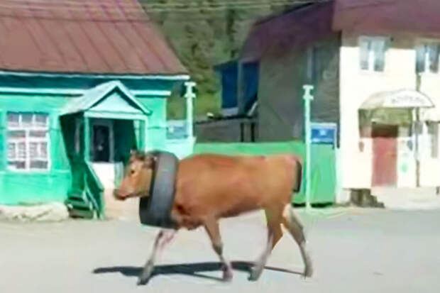 Очевидцы запечатлели инцидент на видео. На кадрах видно, как бык бежит по дороге, при этом на его шее находится автомобильная шина. На записи также видно, что мимо животного проезжают машины.