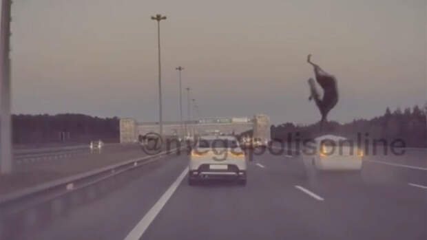 Инцидент произошел на Кольцевой автодороге (КАД). Судя по кадрам, лось выбежал на проезжую часть и попал под колеса легкового автомобиля. Водитель машины в последний момент среагировал на появление препятствия и нажал на тормоз, однако машина ударила животное и оно перелетело через крышу.