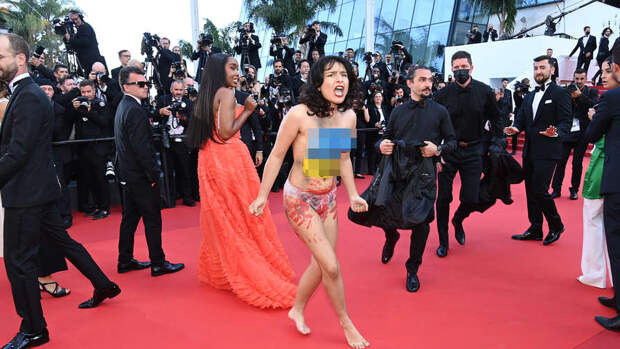 На красную дорожку фестиваля в Каннах выскочила обнаженная женщина, грудь которой была раскрашена в цвета украинского флага. Об этом сообщает журнал The Hollywood Reporter.