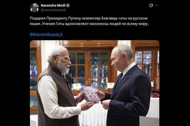 Премьер-министр Индии Нарендра Моди сообщил в социальной сети X, что преподнес президенту России Владимиру Путину экземпляр древнеиндийского эпоса "Бхагавад-гита" на русском языке.