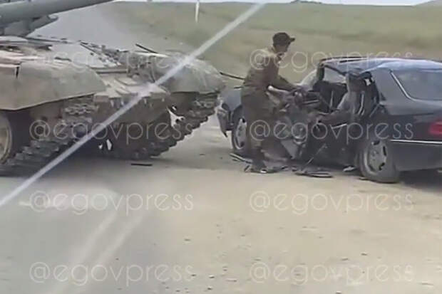 Вся левая часть машины смята. Подоспевшие очевидцы пытаются достать из салона человека. О том, сколько людей пострадало в ДТП, не сообщается.До этого стало известно, что боевой танк раздавил внедорожник Lada Niva в Белгородской области.