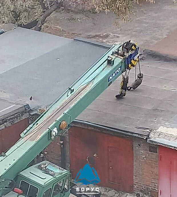 Техника стояла на неровной поверхности и, при попытке поднять груз, кран накренился и оперся стрелой о соседний гараж", - говорится в посте.Уточняется, что все объекты уцелели.