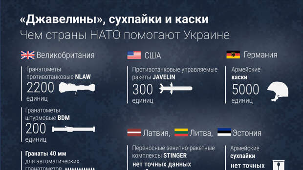 На фоне постоянных сообщений западных медиа и заявлений политиков о якобы готовящимся "вторжении" России на Украину активизировались поставки оружия и военного обмундирования Киеву из стран НАТО. Москва категорически отрицает факт подготовки "вторжения". "Газета.Ru" обобщила данные из открытых источников о последних военных поставках на Украину.
