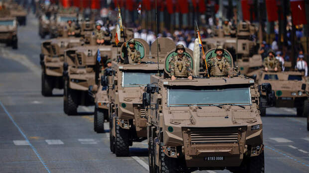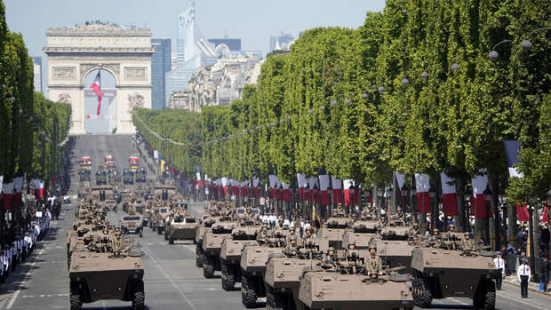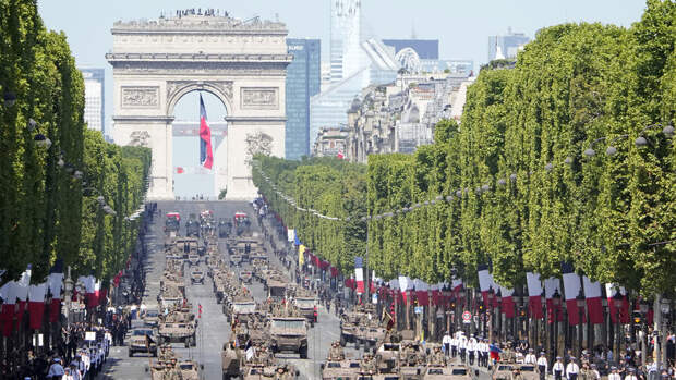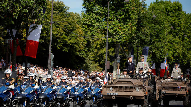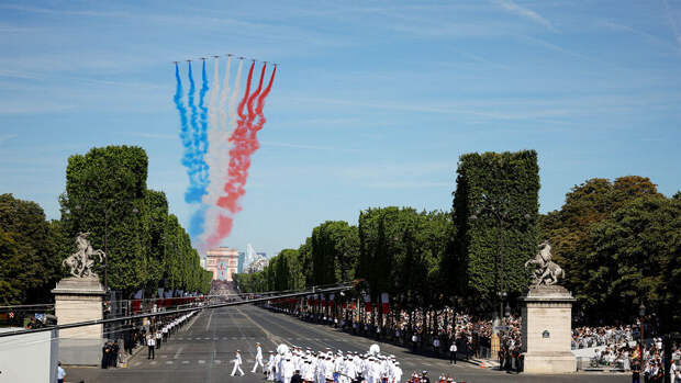 Сегодня в столице на Елисейских Полях состоялся традиционный военный парад. Президент страны Эммануэль Макрон проехал в открытом автомобиле в сопровождении генералов от Триумфальной арки к трибуне на площади Согласия.