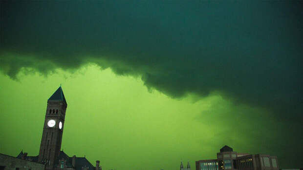 Впрочем, все точки над i расставил метеоролог Национальной метеорологической службы США. Специалист объяснил, что облака могут быть зеленого цвета, когда свет от закатного яркого солнца преломляется и взаимодействует с частицами воды и льда.