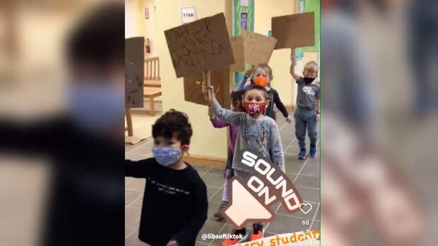 На ролике, опубликованном @lowellschooldc, маленькие дети идут по коридору, держа в руках картонки, на которых присутствуют надписи BLM, а также поют.