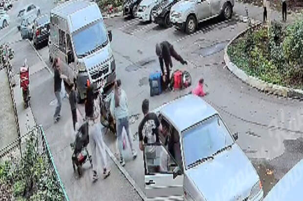 Мужчина занимался выгрузкой вещей из автомобиля. Спустя некоторое время девочка в розовой куртке выбежала на дорогу из-за припаркованного микроавтобуса, ее сбил скутерист.Мужчина немедленно начал бить водителя скутера и нанес ему не менее девяти ударов кулаком, а затем применил удушающий прием и повалил на землю.
