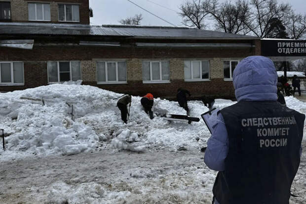 Следователи осматривают место происшествия и устанавливают все обстоятельства случившегося. В рамках расследования дела, возбужденного по ст. 293 УК РФ, планируется дать правовую оценку действиям (бездействию) лиц, которые отвечали за своевременную очистку зданий больницы от снега.
