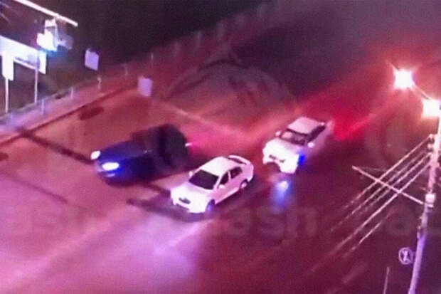 Сначала нетрезвый инспектор врезался в два автомобиля, стоящих у светофора. На видеозаписи с камеры наблюдения видно, что белый автомобиль сначала протаранил кроссовер темного цвета, который отбросило в правую полосу.