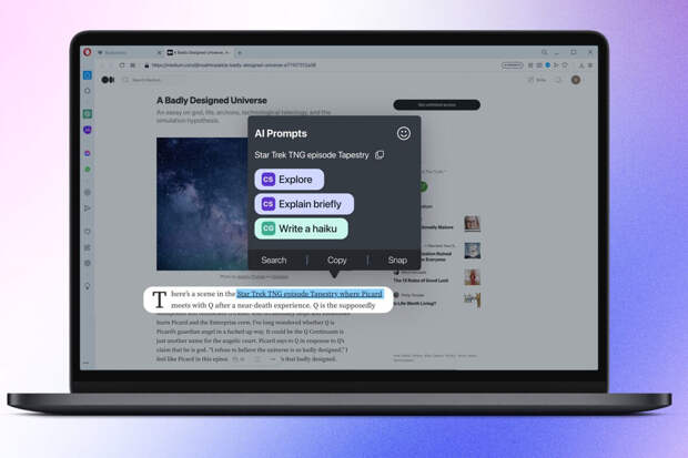В браузерах Opera и Opera GX появились новые функции на базе искусственного интеллекта. Среди них контекстные подсказки AI Prompts, а также интеграция популярных сервисов ChatGPT и ChatSonic в боковую панель.