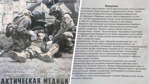 На базе украинского полка "Азов" в Мариуполе корреспонденты РИА "Новости" нашли пособие по тактической медицине ООСН (отдельного отряда специального назначения) для национальной гвардии Украины "Азов".
