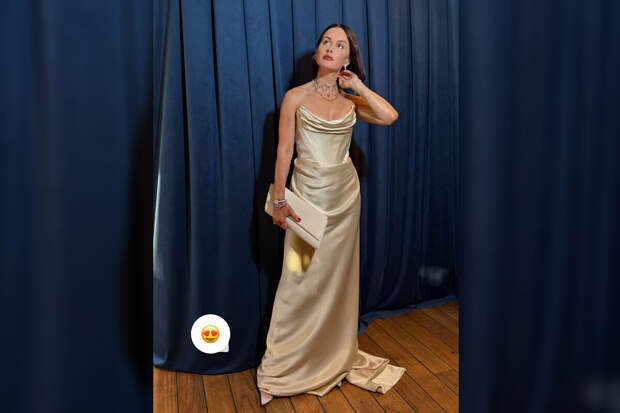 49-летняя Тина Канделаки предстала перед камерой в молочном корсетном макси-платье и туфлях на каблуках. Продюсер добавила к образу серьги, золотые ожерелья, браслеты и кольца.