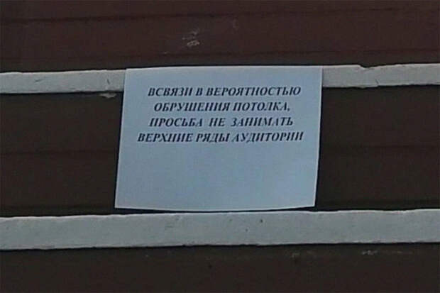 В Иркутске студентов медицинского университета попросили не занимать верхние ряды в аудитории. По словам администрации, в помещении может обвалиться потолок. Об этом сообщает Telegram-канал Babr Mash.
