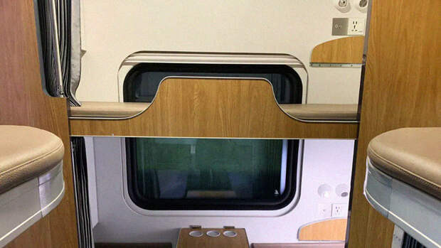 Как стало известно ранее, в новой разработке появились индивидуальные столики для пассажиров верхних полок, а также шторки для каждого пассажира. Вагон выполнен в бежево-серых тонах, он вмешает 54 пассажира.