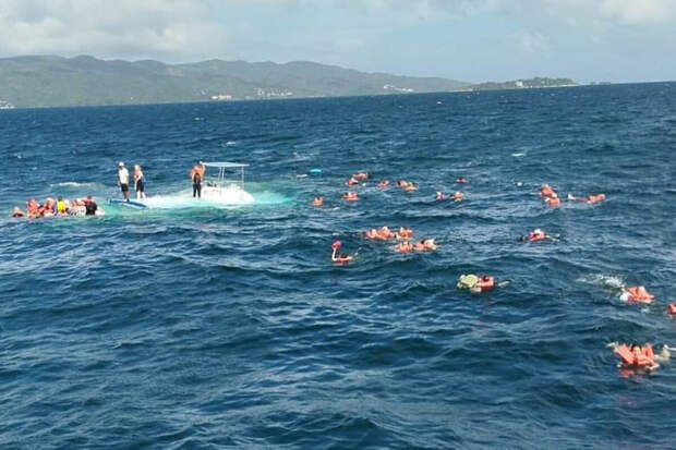 Десятки пассажиров круиза остались плавать в Карибском море после того, как катамаран затонул во время экскурсии, пишет Daily Mail.
