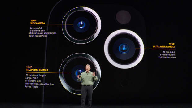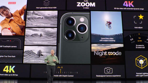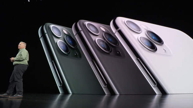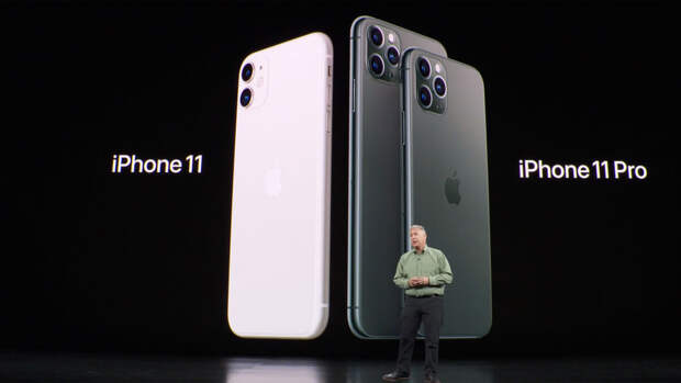 Экран — Liquid Retina диагональю 6,1 дюйма, две основные камеры (сверхширокоугольная и широкоугольная), процессор нового поколения A13. Корпус из стекла и алюминия, шесть цветов, цена от $699 за версию с 64 Гб памяти до $849 за максимальные 256 Гб.Новым флагманом стала модель iPhone 11 Pro — первый для Apple телефон с тремя 12-мегапиксельными камерами, которые, как и шутили в интернете, расположили в виде головки электробритвы (а не в рядок, как у конкурентов). Экран — Super Retina XDR диагональю 5,8 дюйма, корпус из "нержавейки" и стекла, новый модный зеленый цвет в военном стиле. Стоить устройство будет от $999 за 64 Гб до $1349 за 512 Гб.