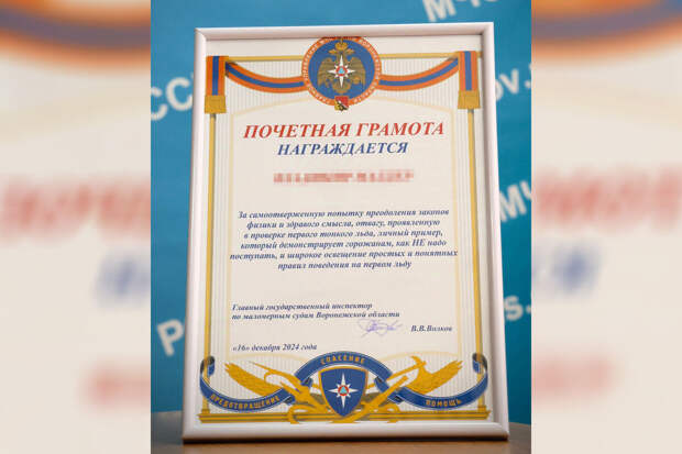 В Воронеже мужчина получил грамоту от МЧС после падения под лед. Об этом сообщает управление ведомства по региону.