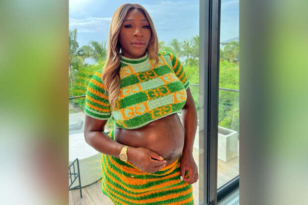 На снимках 41-летняя Серена Уильямс, которая сейчас ждет второго ребенка от своего мужа Алексиса Оганяна, позировала в трикотажном костюме в желто-зеленую полоску от итальянского модного дома Gucci.