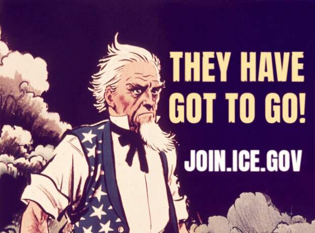 Пост сопровождается плакатом, на котором Дядя Сэм призывает американцев вступить в ряды иммиграционной полиции.