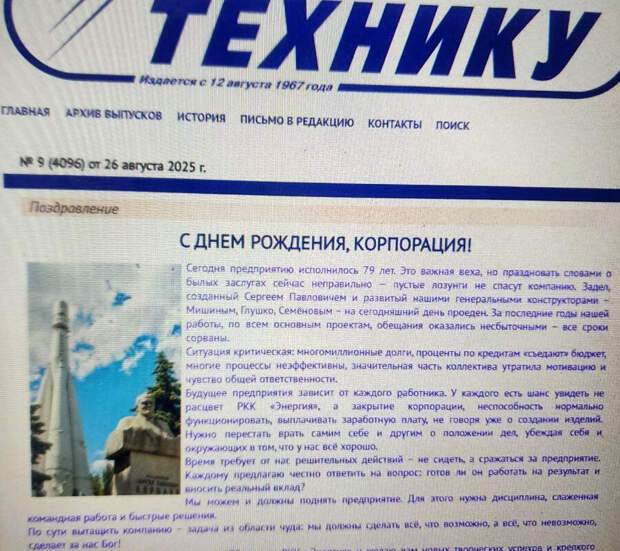 Глава РКК "Энергия" описал ситуацию как критическую: "многомиллионные долги, проценты по кредитам "съедают" бюджет, многие процессы неэффективны, значительная часть коллектива утратила мотивацию и чувство общей ответственности".