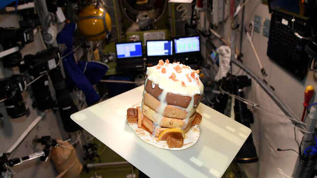 Космонавты сделали кулич из нескольких видов печенья: "Русского", "Восток" и имбирного с курагой, а также добавили медовую коврижку, лепешку, джемы с лимоном и имбирем и мед.