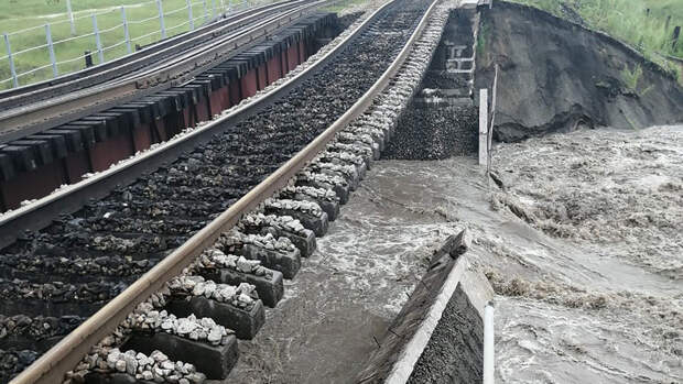 В Забайкалье несколько дней идут сильные ливни с грозами, из-за паводка обрушился железнодорожный мост. Движение поездов на пострадавшей ветке железной дороги было остановлено в обе стороны.
