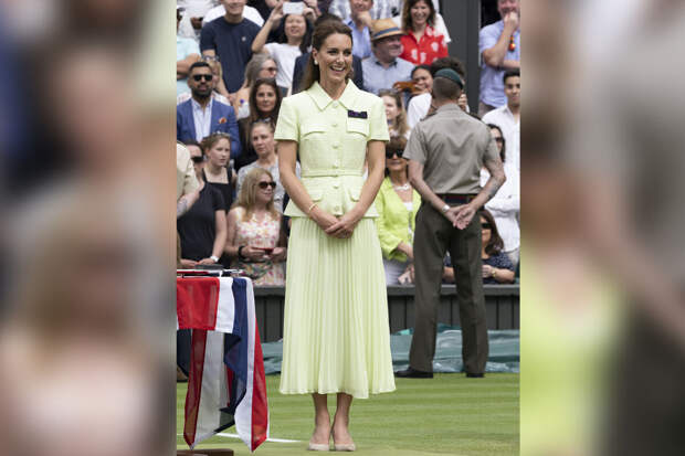 41-летняя принцесса Уэльская, которая является патроном Всеанглийского клуба тенниса и крокета, появилась на теннисном матче в платье-миди из лаймового букле и шифона и с фиолетово-зеленой лентой Уимблдона.