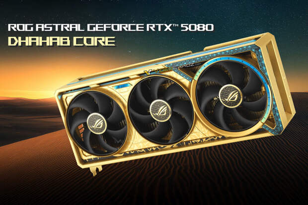 ASUS ROG Astral RTX 5080 оснащена 16 ГБ видеопамяти стандарта GDDR7 и использует 256-битную шину. Ключевой особенностью модификации Dhahab является оформление системы охлаждения с применением 6,5 грамма золота 999-й пробы (99,9% чистого металла).