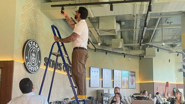 Перед долгожданным открытием новых кофеен на месте Starbucks Тимати лично контролировал все процессы. Корреспонденты успели заснять, как он сам поправляет лампочки над баром в Stars Coffee.
