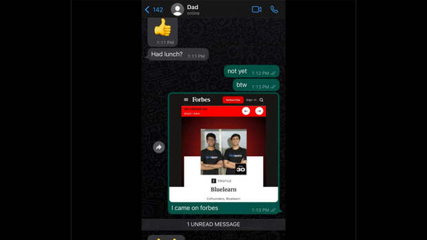 Мужчина, узнав об этом, поделился радостью с отцом, но его реакция оказалась неожиданной для сына.Вместо того, чтобы написать сообщение и похвалить ребенка, отец отправил ему два смайлика с большим пальцем, поднятым вверх. Это настолько развеселило Хариша, что он сделал скриншот, которым поделился с пользователями соцсетей.
